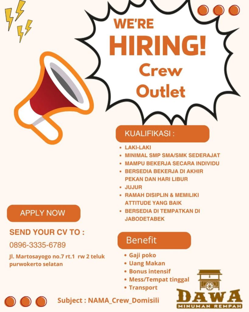 Artikel ini akan membahas secara lengkap mengenai lowongan kerja Crew Outlet Dawa Minuman Rempah, mulai dari deskripsi pekerjaan, kualifikasi, benefit, lokasi penempatan, hingga cara melamar kerja secara resmi.