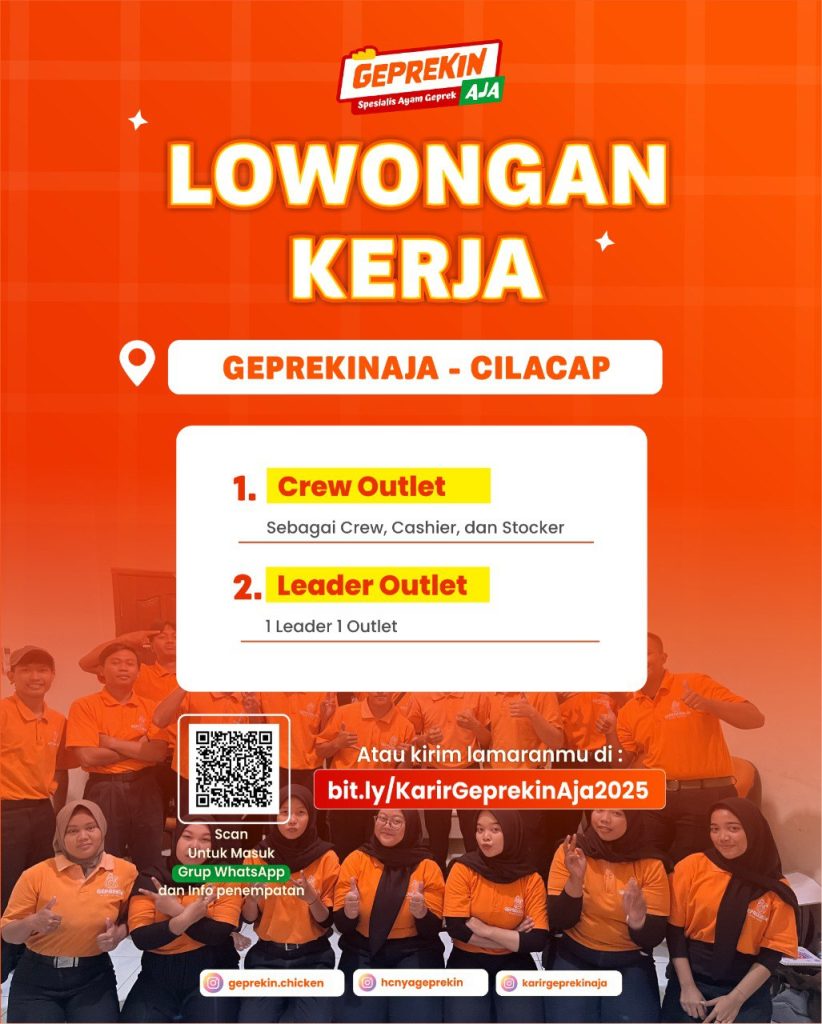 Lowongan kerja ini ditujukan bagi individu yang memiliki semangat kerja tinggi, siap bekerja dalam tim, serta ingin berkembang bersama brand kuliner yang dinamis dan profesional. Dengan sistem kerja yang terstruktur, lingkungan kerja yang suportif, serta peluang jenjang karier yang jelas, lowongan Geprekin Aja Cilacap menjadi salah satu peluang kerja menarik di tahun 2025.