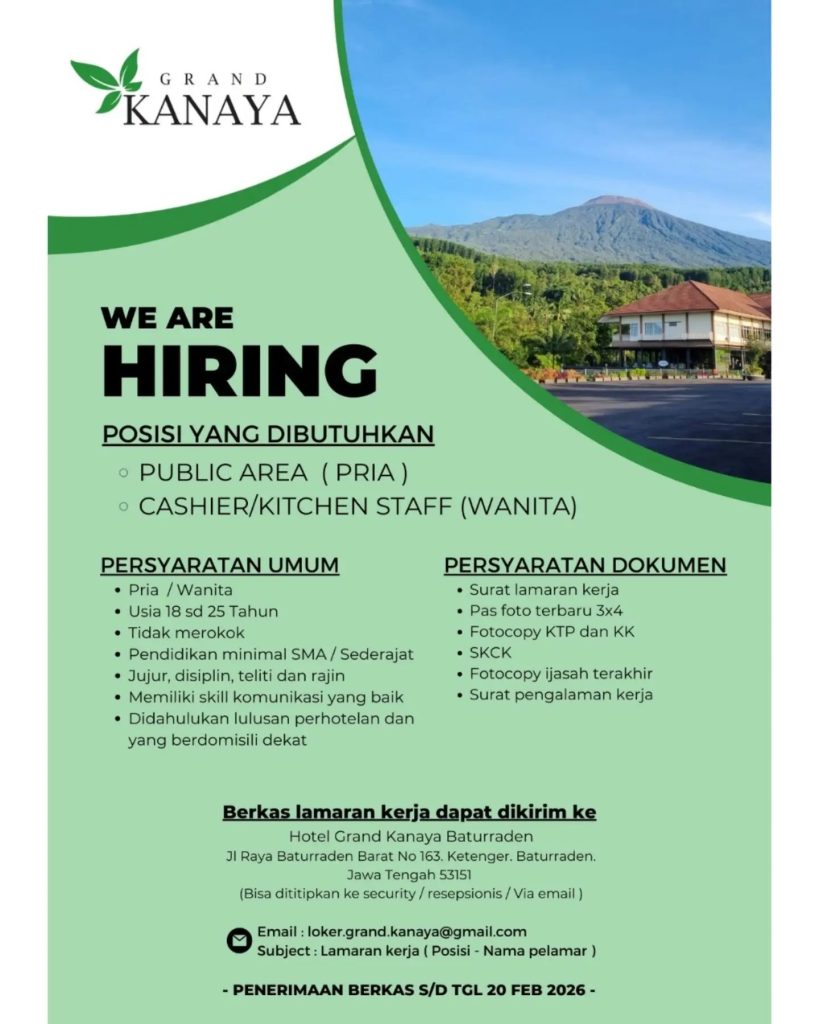 Hotel Grand Kanaya Baturraden membuka lowongan kerja Februari 2026 untuk posisi Public Area (Pria) dan Cashier/Kitchen Staff (Wanita). Kandidat yang dibutuhkan berusia 18–25 tahun, minimal lulusan SMA/sederajat, tidak merokok, jujur, disiplin, dan memiliki komunikasi yang baik.