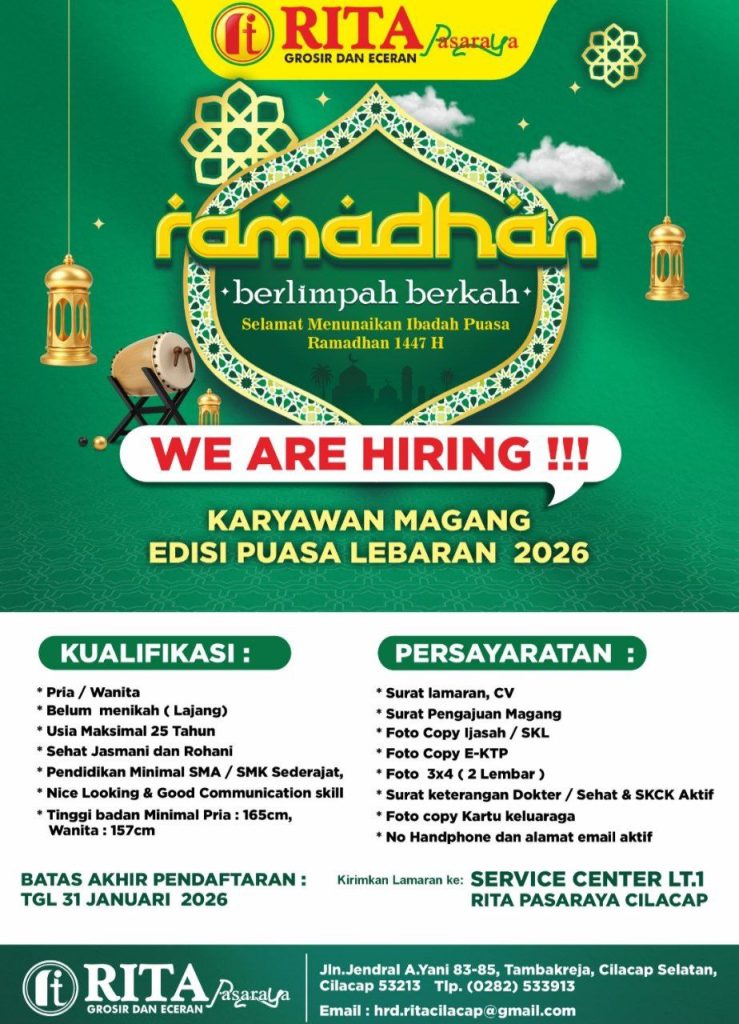 Menjawab kebutuhan tersebut, Rita Pasaraya Cilacap, salah satu pusat perbelanjaan grosir dan eceran terkemuka di wilayah Cilacap, kembali membuka lowongan kerja magang edisi Puasa Lebaran 2026. Program magang ini dirancang sebagai kesempatan bagi lulusan SMA/SMK sederajat untuk terlibat langsung dalam operasional ritel modern, sekaligus melatih keterampilan kerja, komunikasi, dan pelayanan pelanggan.